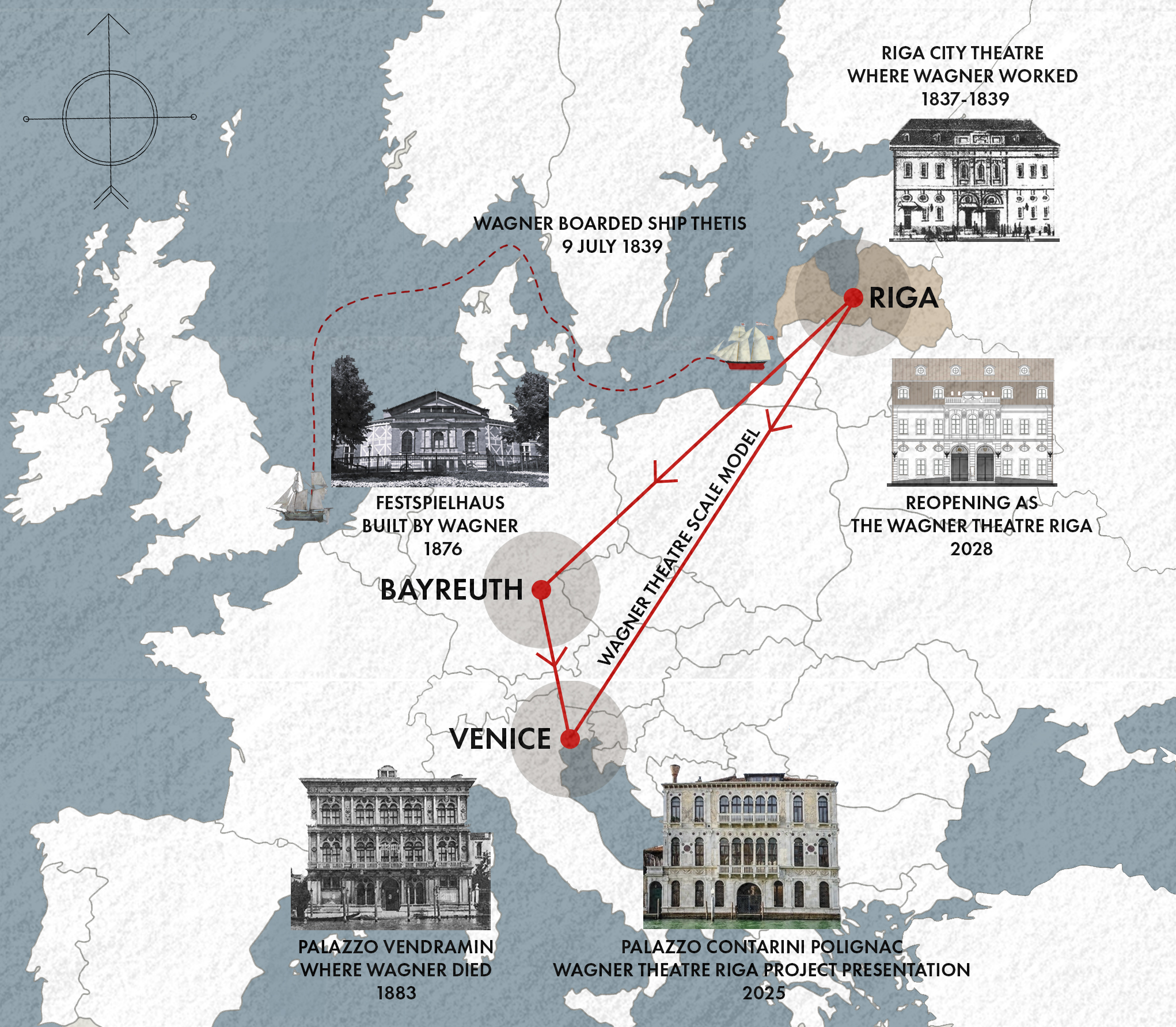 Rīgas Riharda Vāgnera biedrība (RRVB) un Zaigas Gailes birojs (ZGB) uzsver, ka ar Vāgnera nama un teātra projekta prezentāciju Venēcijā noslēdzas laika loks, kas savieno Rīgu, Baireitu, Venēciju un atkal Rīgu. Trijstūris jeb “Vāgnera trijstūris” Eiropas kartē iezīmē trīs Rihardam Vāgneram būtiskas vietas. Rīgā Vāgners no 1837. līdz 1839. gadam Pilsētas pirmajā teātrī strādāja par diriģentu. Tieši šeit viņš saprata trīs operas zāles principus, kas pilnīgi atšķīrās no tradicionālajiem – orķestris ir novietots bedrē skatuves priekšā un daļēji zem tās; diriģents orķestra bedrē stāv ar muguru pret skatītājiem; publikas zāle ir aptumšota. Rīgā Rihards Vāgners piedzima kā jaunās operas komponists – strādādams par diriģentu, viņš iesāka komponēt operu “Rienci”. Savukārt bēgot no Rīgas kreditoriem ar kuģi “Thetis”, Vāgners Baltijas jūrā piedzīvoja vētru, kuras iespaidā parādījās vīzija par “Klīstošo holandieti”.